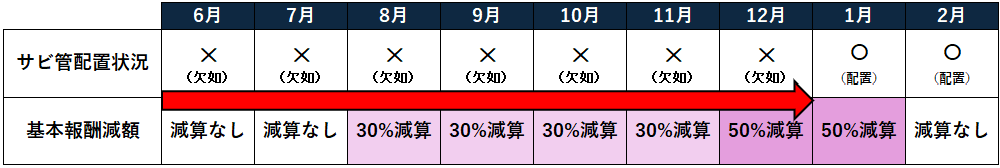 指定基準に定めるサービス管理責任者の人員基準を満たしていない場合、その翌々月から人員基準欠如が解消されるに至った月までの間、基本報酬から減算されます。