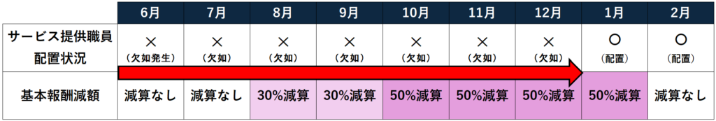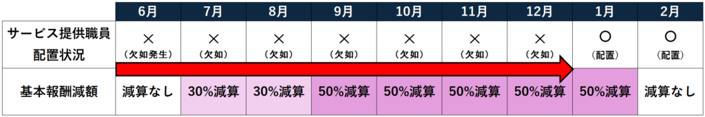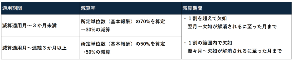 指定基準に定められた人員配置基準を満たしていない場合、欠如率が1割を超えると翌月から、1割以内であれば翌々月から、人員基準の欠如が解消された月までの間、基本報酬が減算されます。