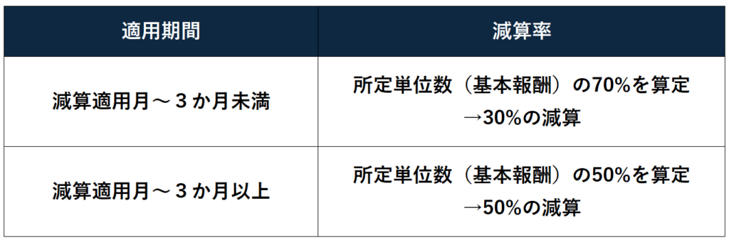 以下のいずれかに該当する利用者について、該当月から当該状態が解消された月の前月までの期間、報酬の減算対象となります。