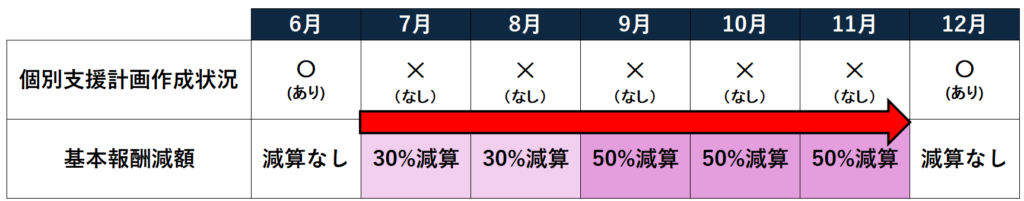 個別支援計画が作成されずにサービス提供が行われていた場合に、当該月から当該状況が解消されるに至った月までの間、基本報酬から減算されます。