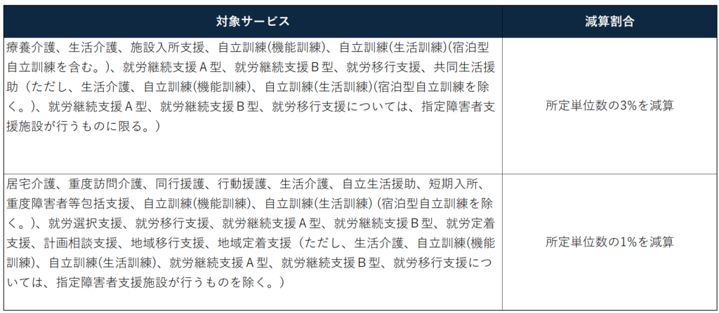 令和7年3月31日までの間、「感染症の予防及びまん延防止のための指針の整備」及び「非常災害に関する具体的計画」の策定を行っている場合には、当該減算を適用しない。ただし、居宅介護、重度訪問介護、同行援護、行動援護、重度障害者等包括支援、自立生活援助、就労定着支援、計画相談支援、地域移行支援、地域定着支援については、「非常災害に関する具体的計画」の策定が求められていないことを踏まえ、令和7年3月31日までの間、当該減算を適用しない。